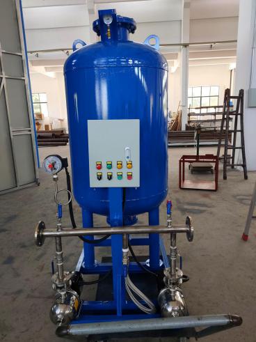 初始运行时首先启动补水泵向系统及气压罐内的水室中充水,系统充满后多余的水被挤进胶囊内。因为水的不可压缩性,随着水量的不断增加,水室的体积也不断的扩大而压缩气室,罐内的压力也不断的升高。当压力达到设计压力时,通过压力控制器使补水泵关闭。当系统内的水受热膨胀使系统压力升高超过设计压力时,多余的水通过电磁阀排至补水箱循环使用,当系统压力超过管网或设备工作压力时,安全阀开启,起到保护管网和设备的作用,当系统中的水由于泄露或温度下降而体积缩小,系统压力降低时,胶囊中的水被不断压入管网补充系统的压降损失,当系统压力至设计允许的低压力时,通过压力控制器使补水泵重新启动向管网及气压罐内补水,如此周而复始。