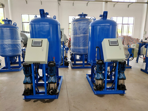 定压补水机组由隔膜式气压水罐、压力开关(或远传压力表)、放气阀、安全阀、进出水管、水泵、控制箱等组成。