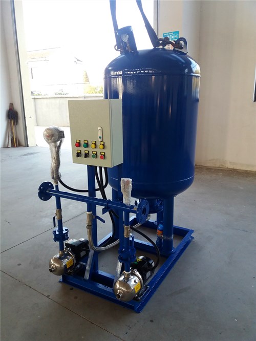 初始运行时首先启动补水泵向系统及气压罐内的水室中充水,系统充满后多余的水被挤进胶囊内。因为水的不可压缩性,随着水量的不断增加,水室的体积也不断的扩大而压缩气室,罐内的压力也不断的升高。当压力达到设计压力时,通过压力控制器使补水泵关闭。当系统内的水受热膨胀使系统压力升高超过设计压力时,多余的水通过电磁阀排至补水箱循环使用,当系统压力超过管网或设备工作压力时,安全阀开启,起到保护管网和设备的作用,当系统中的水由于泄露或温度下降而体积缩小,系统压力降低时,胶囊中的水被不断压入管网补充系统的压降损失,当系统压力至设计允许的低压力时,通过压力控制器使补水泵重新启动向管网及气压罐内补水,如此周而复始。