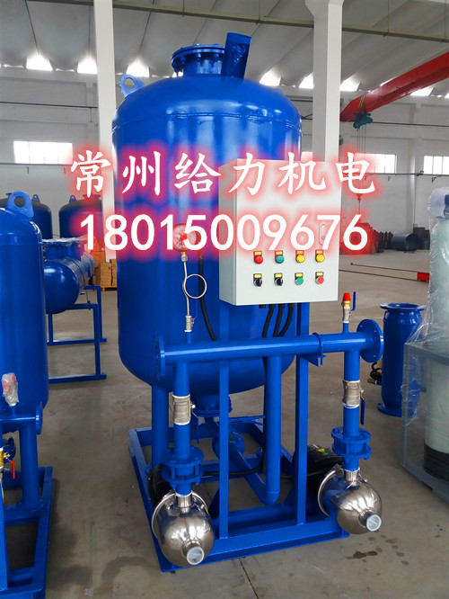 定压补水装置设备采用系统静压作为膨胀水箱内的设计初始压力水头,采用保证系统内热水不汽化的压力作为膨胀水箱内动行终端压力水头。初始运行时首先启动补水泵向系统及气压罐内的水室中充水,系统充满后多余的水被挤进胶囊内。因为水的不可压缩性,随着水量的不断增加,水室的体积也不断的扩大而压缩气室,罐内的压力也不断的升高。当压力达到设计压力时,通过压力控制器使补水泵关闭。当系统内的水受热膨胀使系统压力升高超过设计压力时,多余的水通过安全阀排至补水箱循环使用,当系统中的水由于泄露或温度下降而体积缩小,系统压力降低时,胶囊中的水被不断压入管网补充系统的压降损失,当系统压力至设计允许的最低压力时,通过压力控制器使补水泵重新启动向管网及气压罐内补水,如此周而复始。
