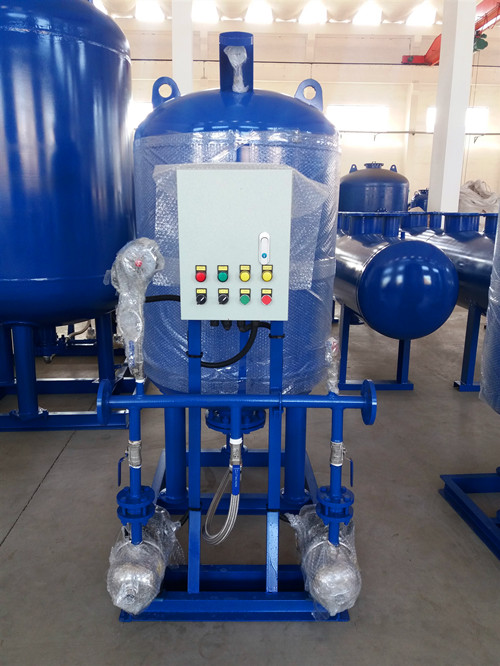 定压补水装置设备采用系统静压作为膨胀水箱内的设计初始压力水头,采用保证系统内热水不汽化的压力作为膨胀水箱内动行终端压力水头。初始运行时首先启动补水泵向系统及气压罐内的水室中充水,系统充满后多余的水被挤进胶囊内。因为水的不可压缩性,随着水量的不断增加,水室的体积也不断的扩大而压缩气室,罐内的压力也不断的升高。当压力达到设计压力时,通过压力控制器使补水泵关闭。当系统内的水受热膨胀使系统压力升高超过设计压力时,多余的水通过安全阀排至补水箱循环使用,当系统中的水由于泄露或温度下降而体积缩小,系统压力降低时,胶囊中的水被不断压入管网补充系统的压降损失,当系统压力至设计允许的最低压力时,通过压力控制器使补水泵重新启动向管网及气压罐内补水,如此周而复始。