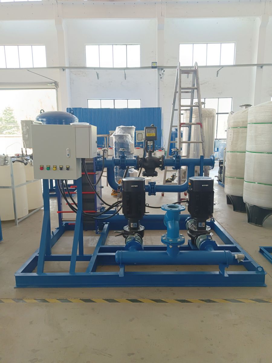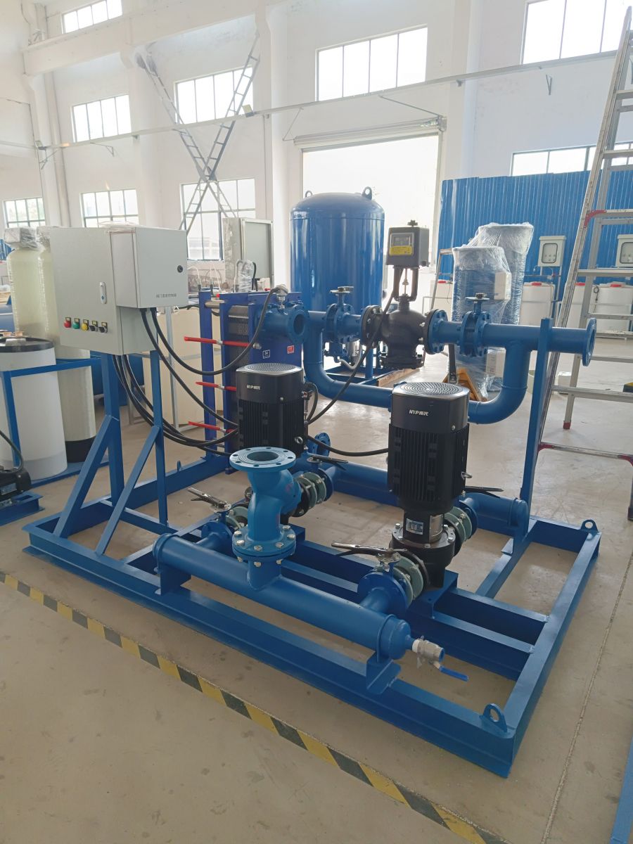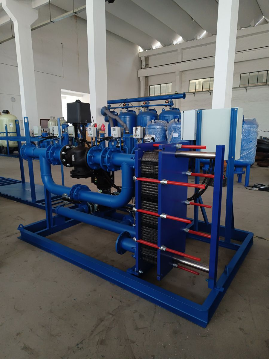 板式换热机组,为换热机组的一种型号,其特点是采用板式换热器,在相同压力损失情况下,其传热系数比管式换热器高3-5倍,占地面积为管式换热器的三分之一,热回收率高。设备由板式换热器、智能温控装置、智能电控装置、循环泵、补水泵、稳压膨胀水箱、补(凝)水箱、过滤器、阀门、仪表、传感器、配管底座等组成。
