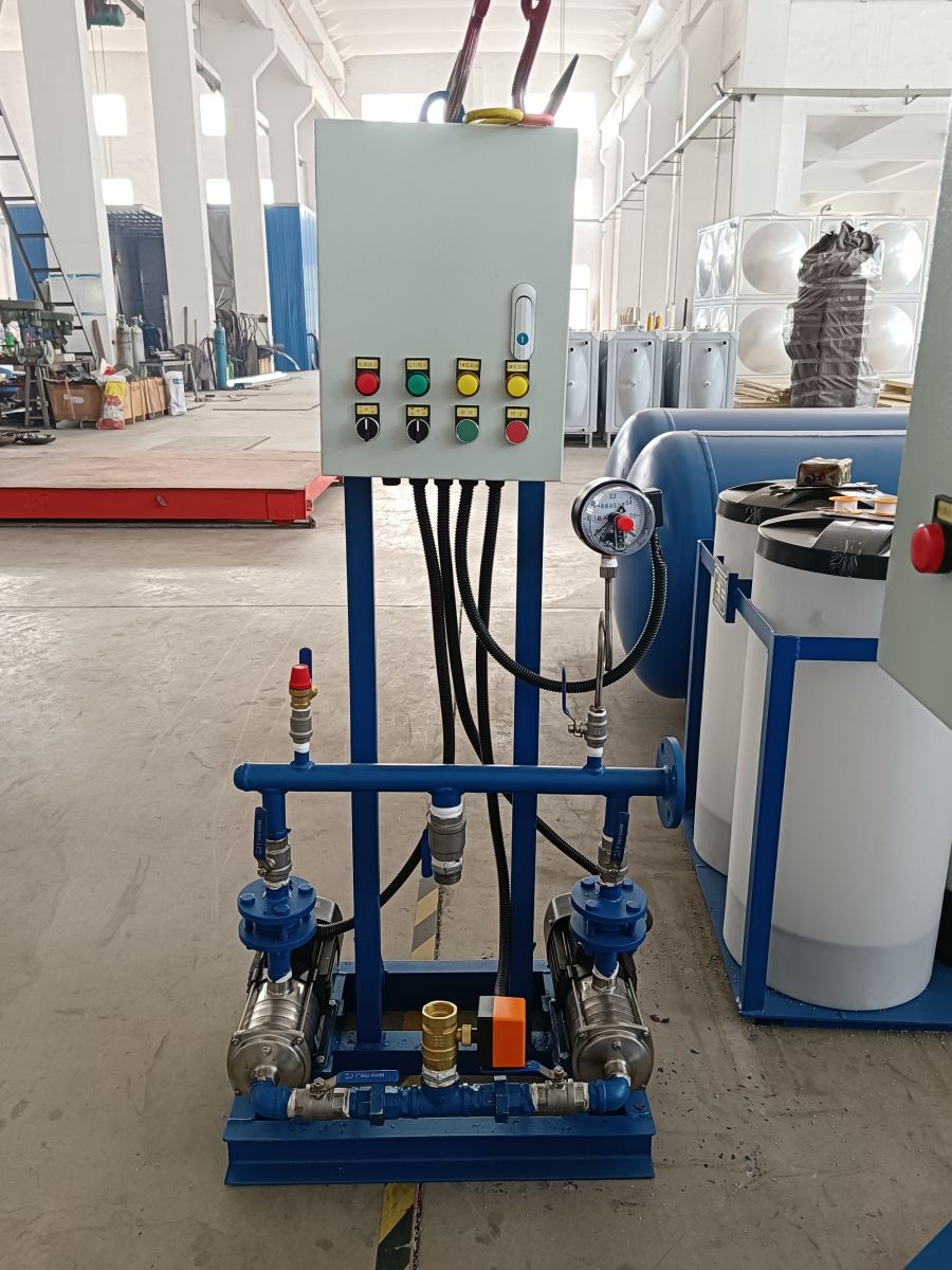 定压补水机组由囊式压力罐、水泵、控制箱、底架、压力感应装置、管道阀门等组合而成,是一种兼有升压、调节、储水、供水等多种功能的常用供水设备。定压补水机组利用气压罐的可调节能力,可自动调节用户水量的变化,当用水量减少或不用水时,可较长时间不启动水泵,达到节能目的。与水塔、高位水箱相比可节省投资约40%-60%。该设备结构紧凑,与其他传统的供水装置相比减少了占地面积,节省了土地资源。本设备全自动运行,无需专人管理,工作可靠。