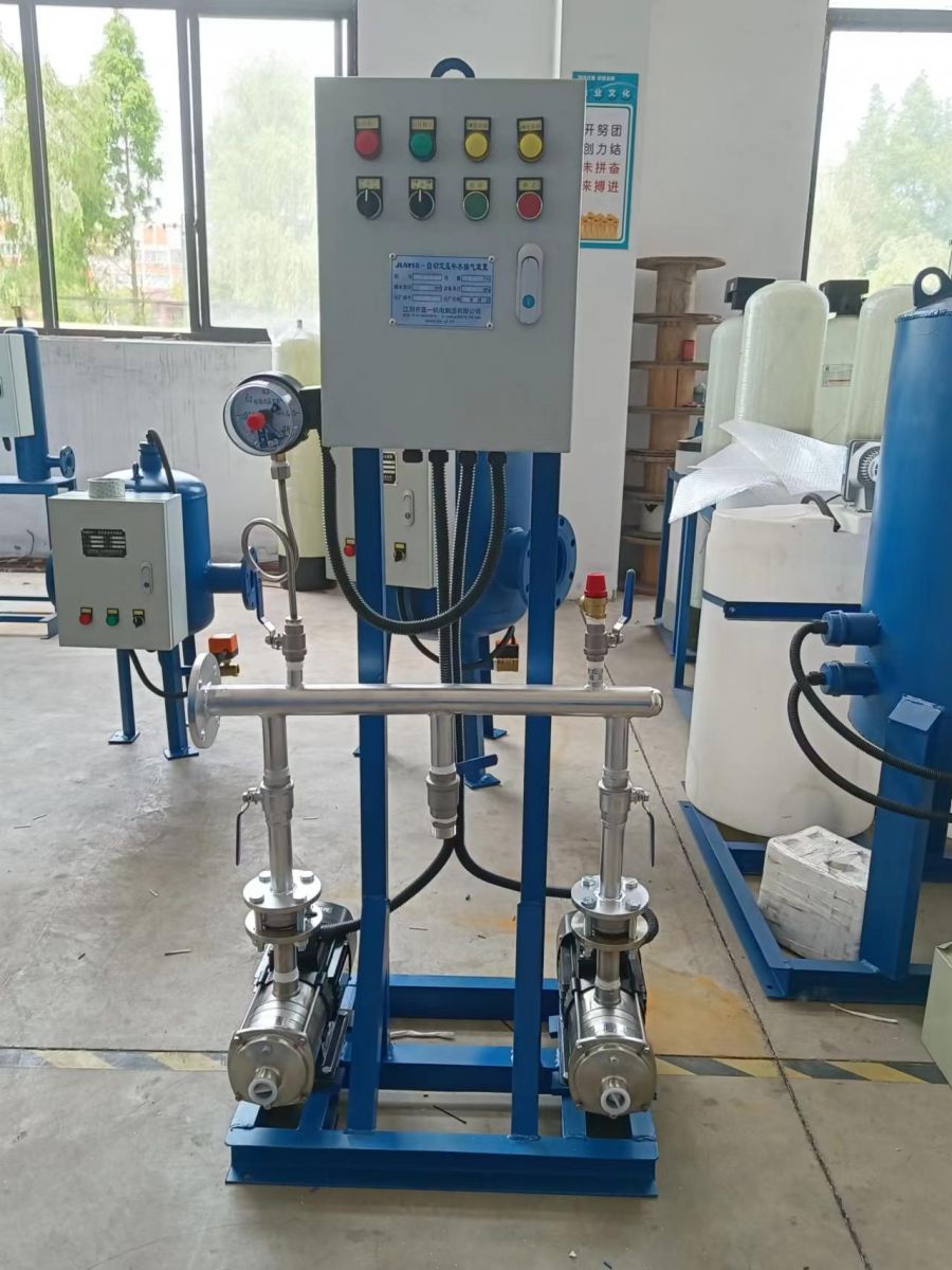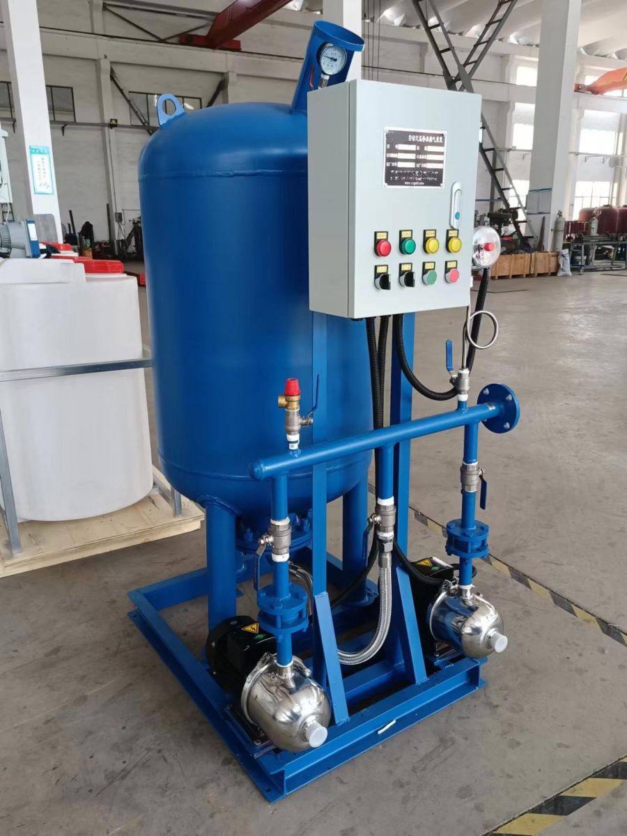 定压补水机组由囊式压力罐、水泵、控制箱、底架、压力感应装置、管道阀门等组合而成,是一种兼有升压、调节、储水、供水等多种功能的常用供水设备。定压补水机组利用气压罐的可调节能力,可自动调节用户水量的变化,当用水量减少或不用水时,可较长时间不启动水泵,达到节能目的。与水塔、高位水箱相比可节省投资约40%-60%。该设备结构紧凑,与其他传统的供水装置相比减少了占地面积,节省了土地资源。本设备全自动运行,无需专人管理,工作可靠。